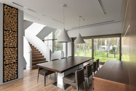 360 m² namas Valakampiuose. Aiškus stačiakampio garbinimas objekte, tačiau skirtingi lygiai jungiasi lenktais elementais (laiptais), parodydami kas „kietesnis“, visa kita tik detalės.